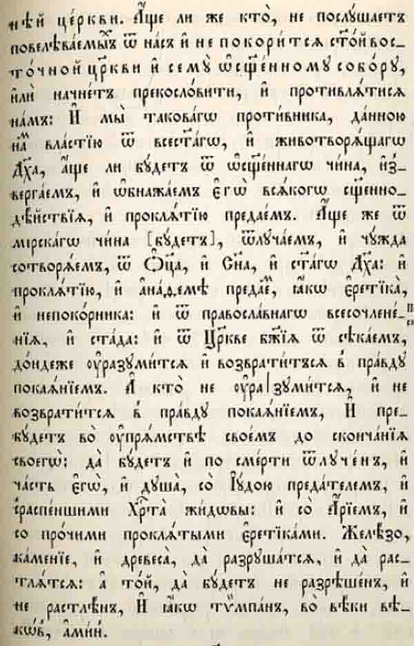 ის, რასაც სრულიად უსამართლოდ აბრალებენ ძველმორწმუნე მართლმადიდებელთ, სინამდვილეში გახლდათ პატრიარქ ნიკონის და მის მიერ მოწვეულ იერარქთა უმძიმესი შეცდომა. მათ ანათემას გადასცეს და ოკულტიზმისთვის დამახასიათებელი საშინელი წყევლა-კრულვებით "შეჰკრეს" ის ადამიანები, რომლებიც არ ეთანხმებოდნენ IX-X საუკუნეებში, რუსეთის გაქრისტიანების დროს, თვით ძველ ბერძენთაგან მიღებულ საეკლესიო წეს-განგებათა მწვალებლობად გამოცხადებას და მათ შეჩვენებას.